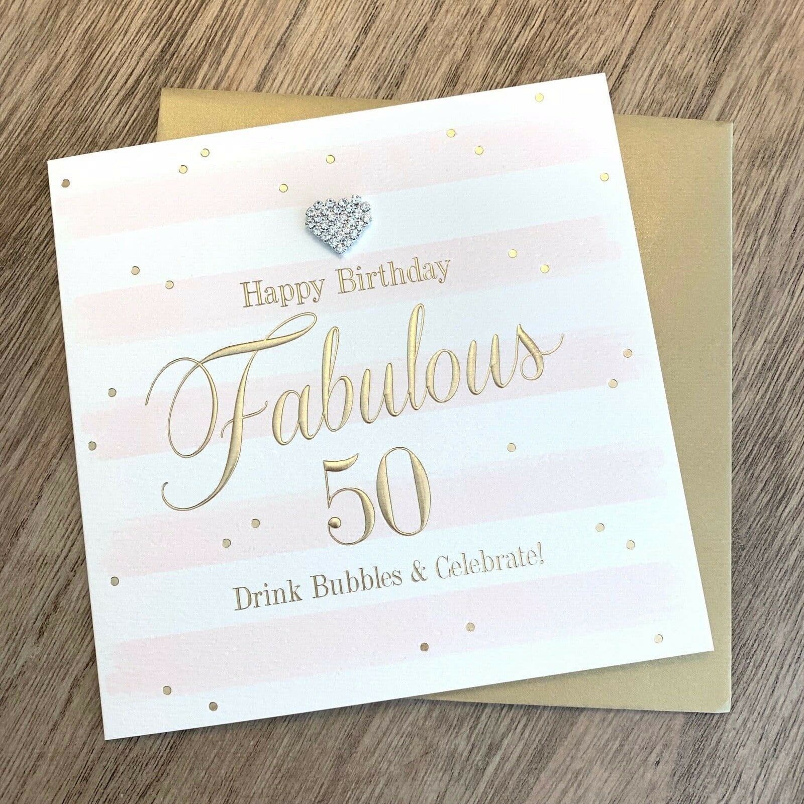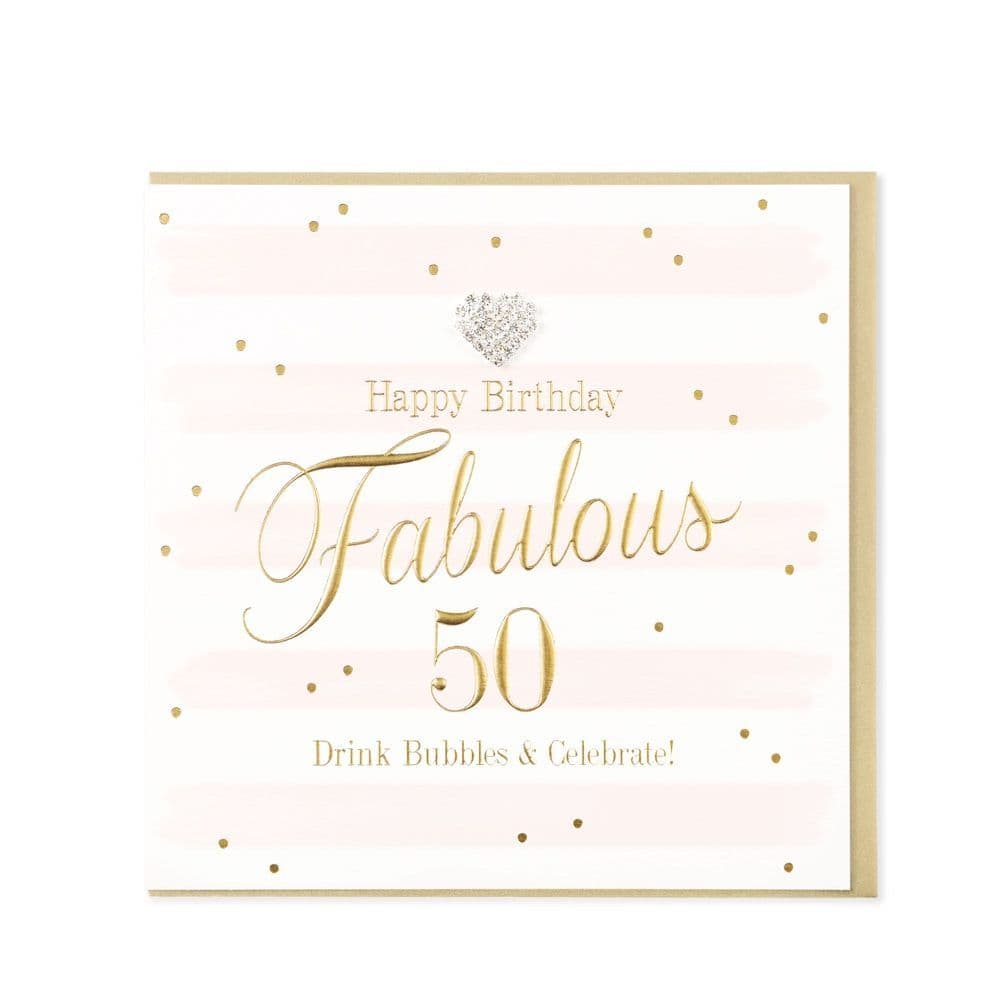 Super gorgeous, luxury 50th Birthday Card with words reading 'Happy Birthday Fabulous 50 Drink Bubbles & Celebrate'. This card is so pretty and has a sparkly diamanté heart embellishment, embossed gold foil wording, ivory & soft pink horizontal stripes and a sprinkling of golden dots. You'll be sending the recipient birthday wishes in style with this fab-u-lous card! These cards are blank inside for your own message. Comes with golden coloured envelope.