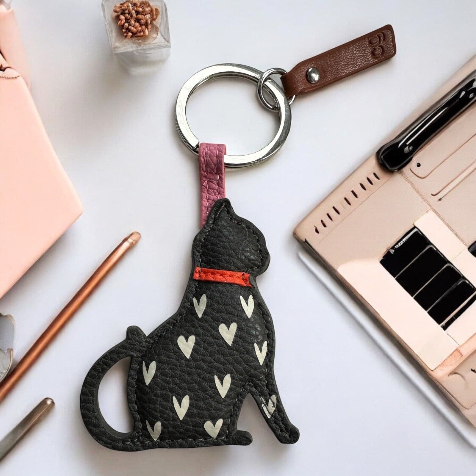 A cat lovers keyring delight! This lovely Caroline Gardner keyring with hearts is manufactured using vegan leather and has pretty heart detailing the cat has a neon orange collar.